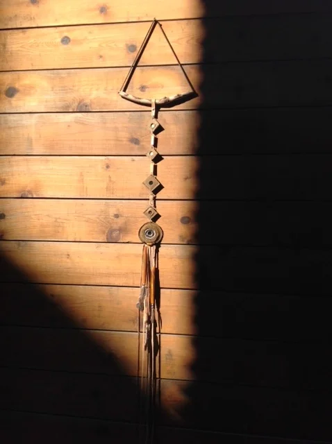 leather, feather, mirror, bone beads, brass, + driftwood