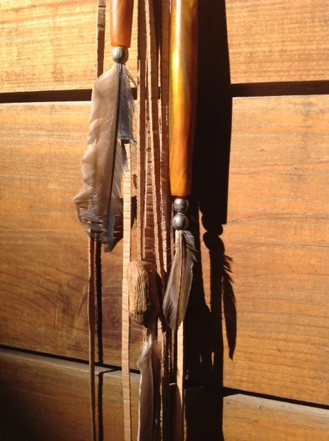 leather, feather, wood, brass, + quartz crystal